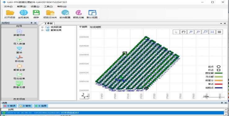 解算所得照片pos均为固定解,此次外业飞行质量较好, 使用UAV-PPK软件处理得到精准的POS数据可进行内业数据处理及三维建模。